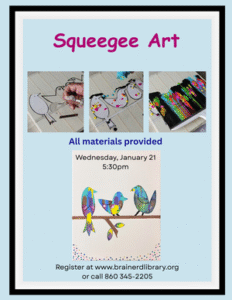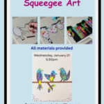 Using templates, masking tape, paint & a squeegee we’ll create unique art on canvas. You can also bring your own stencil or free-hand draw a design. We will cover a canvas with masking tape, add the design, then carefully cut away the tape. Then we add drops of paint and use the squeegee to reveal the painting!