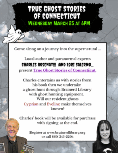 Ready for some spooky stories? Charles Rosenay!!! and Lori Salerno will scare us with Connecticut ghost stories and a paranormal examination of Brainerd Library.