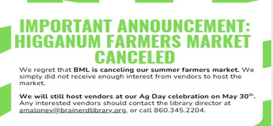 We are sorry to announce that the weekly Wednesday Higganum Farmers’ Markets at the library will not be held. Enough participants have not applied to support the Market. However, there will still be markets and vendors at both Agricultural Day on Saturday, May 30th and Fall Fest on Saturday Sept 19th.